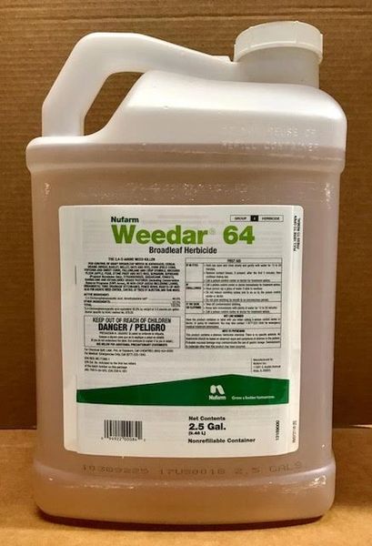 Weedar 64 Broadleaf Herbicide - 2.5 Gal | Seed World Weedar 64 Broadleaf Herbicide To control susceptible broadleaf weeds in cereal grains, corn, sorghum, rice, sugarcane, soybeans (preplant only), turf, non-crop areas, and certain aquatic applications. The recommended rate of use varies. See label for details. Active ingredient: 46.8% 2,4-Dichlorophenoxyacetic acid, dimethylamine salt