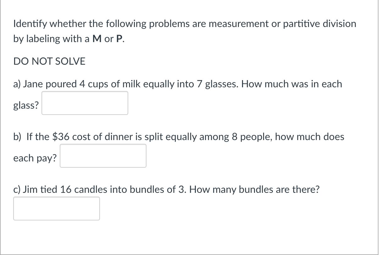 How to check a division problem with a remainder - Quora Answer: (Note: If you're not sure which parts are the quotient, divisor, and dividend, I've included a picture at the bottom of this answer labeling all the parts.) To check your answer when doing a "division problem with a remainder" do the following: 1. (Step 1) multiply the quotient by the d... Division Problems for Children | Practice Problems for Easy and Hard ... If your child needs a challenge, include problems that use multi-digit numbers, decimals and/or remainders. 1. 225 ÷ 5. Make sure your child is formatting long division problems correctly. For this problem, 225 should go under the long division sign, and 5 should go to the left of the sign. The answer, 45, should be written atop the sign. Understanding and Solving Division Story Problems The divisor is the number of groups that you're dividing the dividend into. If you're told that 20 apples cost $40.00, you would divide $40 into groups of 20 to represent the money spent per apple. In this case, 20 would be the divisor. To solve this problem, divide the dividend (40) by the divisor (20) to get the answer (40 ÷ 20 = 2). How To Label A Division Problem / Solved Below Is A Diagram Of A ... How to solve division problems. Labeling a division problem requires you to identify the . Leave me a comment in the box below. Get tips on how to handle mathematics problems that feature division with help from an mit masters candidate in aero/astro engineering in this . Labeling a division problem requires you to identify the .