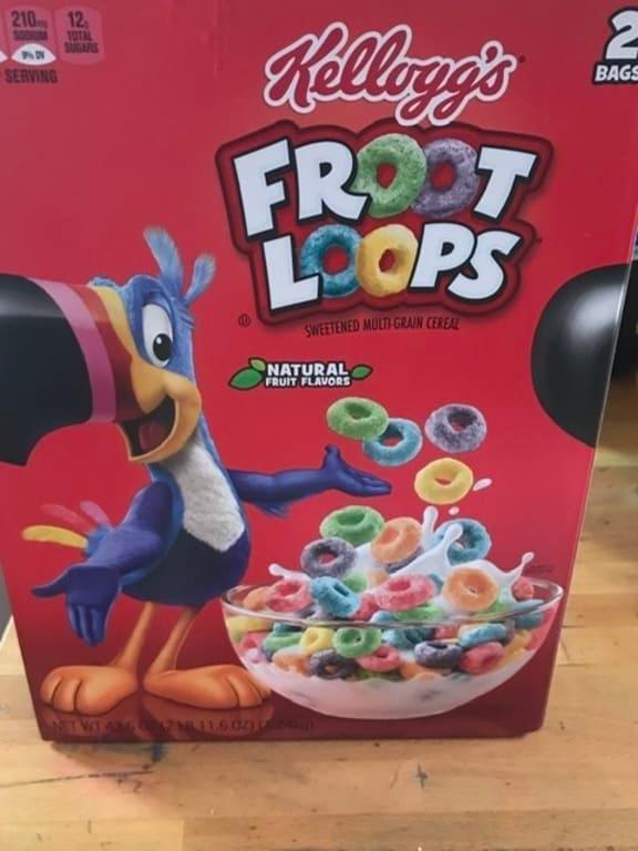 Fruit Loops Nutrition Facts • MyFoodDiary® Kellogg's Froot Loops Birthday Cake Cereal Milk not included. 1 1 ⁄ 3 cups (39g) Nutrition Facts. 150 calories. Log food. Peeps Fruit Loops Pop. 4 chicks (39g) Nutrition Facts. 120 calories. Kellogg's Fruit Loops Cereal Family Size Nutrition Facts Rich in vitamins and minerals (30.3%/cal) - a good source of Iron, Manganese, Vitamin B12, Vitamin D, Vitamin B6, Zinc, Magnesium, Copper, Phosphorus and Potassium. Contains a high amount of risky components that may include sodium and sugars (0.03%/oz). Good source of proteins (18% of DV/100g). Good source of fiber (51% of DV/100g). Fruit Loops Cereal Nutrition Facts | All Menu Price Fruit Loops Cereal - Nutrition Facts. Nutrition Facts. Serving Size: 1. container. Amount Per Serving. Calories 80 % Daily Value * 1% Total Fat 0.5 g grams. 0% Saturated Fat 0 g grams. Trans Fat 0 g grams. 0% Cholesterol 0 mg milligrams. 4% Sodium 100 mg milligrams. 6% Total Carbohydrates 18 g grams. 8% Dietary Fiber 2 g grams.