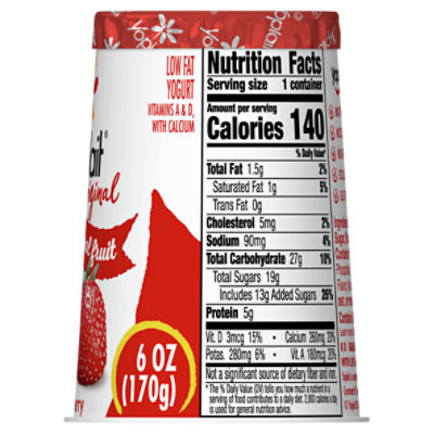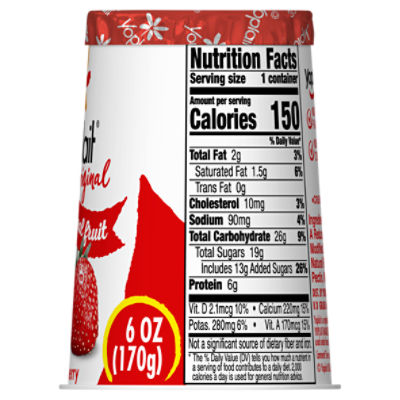 Strawberry | Original Yogurt With Real Fruit| Yoplait CONTAINS MILK INGREDIENTS. YOPLAIT ORIGINAL: Creamy original strawberry yogurt for the perfect breakfast on the go or afternoon snack. MADE WITH GOODNESS: Yoplait yogurt contains no artificial flavors, no high fructose corn syrup and no colors from artificial sources. PROTEIN PACKED: Yoplait yogurt is packed with 6g of protein per serving.