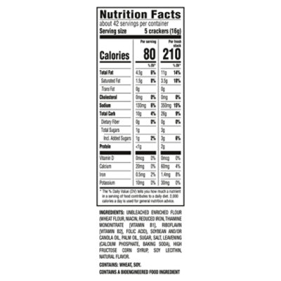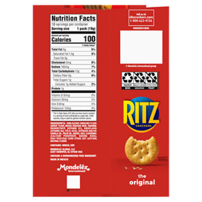 ProductDetails - Ritz Crackers Total Carbs 21g 7.0% Dietary Fiber 2g 8.0% Sugars 1g 0.0% Added Sugars Protein 2g 7.0% VitaminD 0.0% • Calcium 4.0% • Iron 2.0% • Potassium 8.0% Calories 130 Serving Size 21 pieces (30g) Sat fat (g) 0 Sugar (g) 1 Sodium (mg) 190 Ingredients Products | Ritz Crackers Our classic recipe is perfect for any pairing. RITZ ORIGINAL CRACKERS 13.7 OZ. RITZ ORIGINAL CRACKERS 10.3 OZ. RITZ ROASTED VEGETABLE CRACKERS 13.3 OZ. RITZ HONEY WHEAT CRACKERS 13.7 OZ. RITZ GARLIC BUTTER CRACKERS 13.7 OZ. RITZ REDUCED FAT CRACKERS 12.5 OZ. RITZ HINT OF SALT CRACKERS 13.7 OZ. RITZ WHOLE WHEAT CRACKERS 12.9 OZ. Calories in Ritz (Nabisco) Crackers, Original | CalorieKing Calorie Breakdown Where do the calories in Ritz (Nabisco) Crackers, Original come from? 4.7% 47.9% 47.3% Protein Total Fat Total Carbohydrate 16 cal * The % Daily Value (DV) tells you how much a nutrient in a serving of food contributes to a daily diet. 2,000 calories a day is used for general nutrition advice.