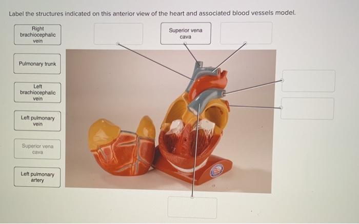 Solved Label the structures seen in the anterior view of the - Chegg View the full answer Transcribed image text: Label the structures seen in the anterior view of the heart. Superior vena cava Interior vena cava Aorta Left atrium Pulmonary trunk Pulmonary vein Left ventricle Pulmonary artery Right ventricle Right atrium Previous question Next question