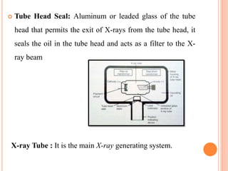 tube head and x-ray tube components Diagram | Quizlet the metal body that contains the x-ray tube and oil. insulating oil prevents over heating, absorbs 99% of energy. tubehead seal keeps oil inside the tube head x-ray tube unleaded glass, heart of the X-ray generating system transformer (the power supply) alerts the voltage of incoming electrical current. collimator