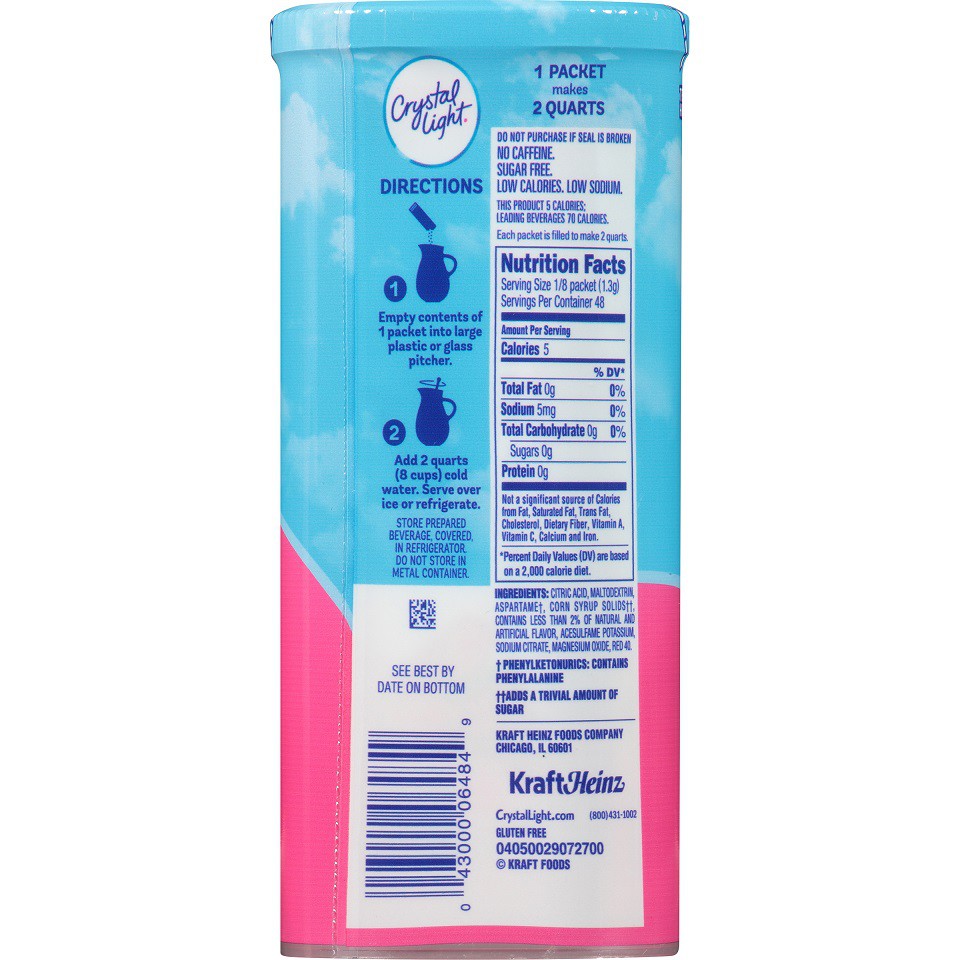 Zero Sugar, Crystal Light, Lemonade Nutrition Facts - Eat This Much Calories, carbs, fat, protein, fiber, cholesterol, and more for Zero Sugar, Crystal Light, Lemonade ( Sorbee). Want to use it in a meal plan? Drink mix by CRYSTAL LIGHT - Nutrition Value Drink mix by CRYSTAL LIGHT nutrition facts and analysis per 0.125 packet (1.8 g) ; Minerals · Sodium, 0.00 mg ; Proteins and Aminoacids · Protein, 0.00 g ... Crystal Light On the Go Natural Lemonade Drink Mix - H-E-B Ingredients Citric Acid, Potassium Citrate, Sodium Citrate, Aspartame (Phenylketonurics: Contains Phenylalanine), Magnesium Oxide, Maltodextrin, Contains Less ...