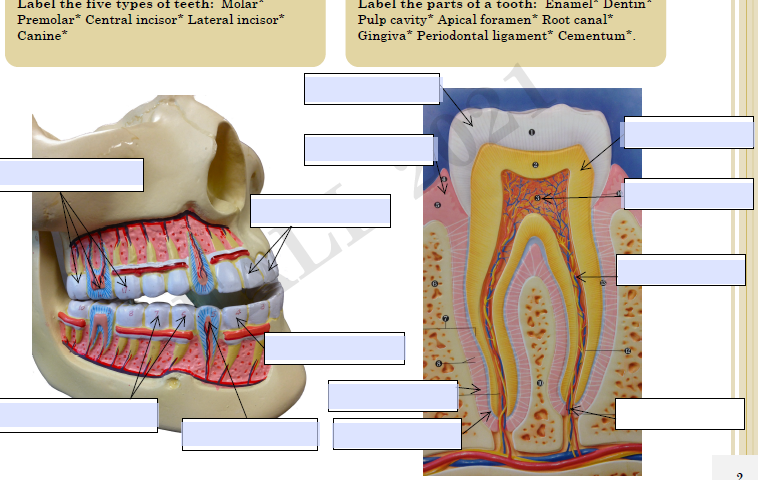 Teeth diagrams and tooth identification quizzes | Kenhub Labeled diagram showing the types of teeth (download free PDF below!) Teeth diagrams labeled and unlabeled Now, similar to some of the exercises in our advanced tooth identification quizzes, it's time for you to add all of the teeth labels onto a blank teeth diagram from memory. This will help you to identify any final gaps in your knowledge. Labeling: Tooth Anatomy Diagram | Quizlet hydroxylapatite (crystalline calcium and phosphorus mineral); enamel is the hardest substance in the body. dentin. cellular and living; like bone. cementum. dense bone-like outer layer of the root. periodontal ligament. collagen fibers for anchoring root to jaw bone. pulp cavity. Tooth labeling Diagram | Quizlet Tooth labeling. Flashcards. Learn. Test. Match. Flashcards. Learn. Test. Match. Created by. Scarr926 PLUS. Terms in this set (16) root axis line. imaginary line representing the long axis of a tooth. cervical line. where the anatomical crown and root join. apex of root. tip or peak at the end of the root.