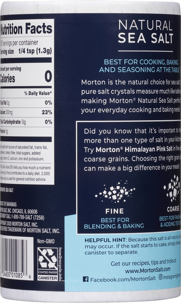 Calories in Morton Sea Salt and Nutrition Facts - FatSecret Nutrition summary: There are 0 calories in 1/4 tsp (1.5 g) of Morton Sea Salt. Calorie breakdown: 0% fat, 0% carbs, 0% protein. Sea salt vs. table salt: What's the difference? - Mayo Clinic But sea salt and table salt have the same basic nutritional value. Sea salt and table salt contain comparable amounts of sodium by weight. Whichever type of salt you enjoy, do so in moderation. The Dietary Guidelines for Americans recommend limiting sodium to less than 2,300 milligrams a day. That's roughly how much sodium is in 1 teaspoon of ...