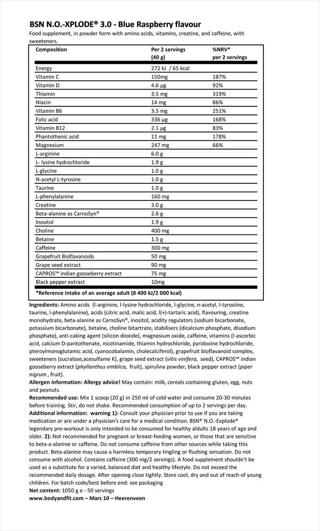 Is N.O.-XPLODE Safe and Effective? - Livestrong Marketed as a means to help jump-start athletic performance and muscle-building, N.O.-XPLODE is a powdered drink containing caffeine, amino acids, vitamins, creatine and herbs meant to be taken before a workout. But does it work, and is it safe? The answers are, at best, unclear. What the Experts Say BSN N.O.-XPLODE Pre-Workout Powder - Bodybuilding.com 290 mg. **. DMAE Bitartrate, (2-Dimethylaminoethanol), DL-Phenylalanine, Nicotinic Acid, Calcium D-Pantothenate, Toothed Clubmoss Extract (aerial parts), Thiamin HCl, Pyridoxine HCl, Cyanocobalamin. ‡ Percent Daily Values are based on a 2,000 calorie diet. ** Daily Value Not Established. GNC - The New N.O.-XPLODE™ Explosive Energy Enhanced Endurance Maximum Performance Focus, Muscular Strength*, and Power BSN ® Pros have crafted the ingredients of N.O.-XPLODE ™ to work together and enhance overall workout performance. The innovative ingredient technology of N.O.-XPLODE ™ features: NO Xplode | BSN NO Xplode - NetNutri Advanced Ingredient Technology. BSN® Pros have crafted the ingredients of NO XPLODE® to work together and enhance overall workout performance.* The innovative ingredient technology of N.O.-XPLODE® features: Explosive Energy. To maximize every moment of your workout and achieve your best results, you need energy.